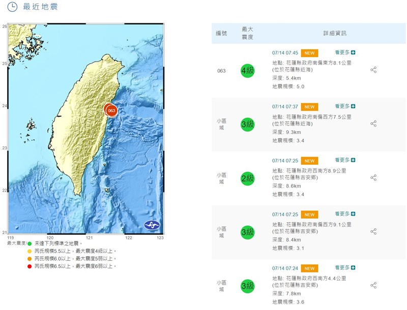 【本報台北訊】花蓮今天清晨發生多起地震,嚇壞不少人,根據根據中央氣象局發布的地震報告,花蓮截至上午8時11分已有19起有感地震。由於日前花蓮縣才發生雙主震,當時餘震也有高達逾十起,氣象局即判斷可能有更大地震,不少人認為今天地震恐與此有關。對此,氣象局表示,目前判定是先前雙主震餘震,預計一周內會有規模4以上餘震,確實非常不尋常。