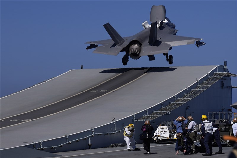 英國航艦伊麗莎白女王號百名官兵確診,參與任務所有官兵均已接種2劑疫苗。圖為艦上F-35戰機起飛。圖/美聯社