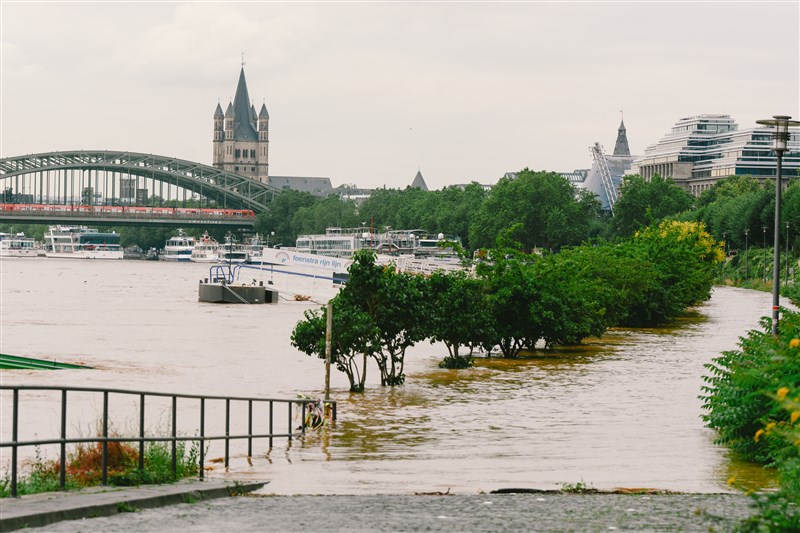 7月15日在德國西部城市科隆拍攝的水位上漲的萊茵河。圖/新華社
