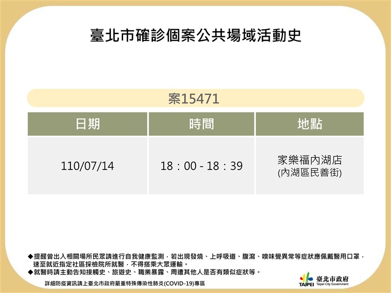 北市3確診足跡Ct值低 足跡重疊者提高警覺 |2021.07.17 語音朗讀 1496觀看次 字級 大 中 小 【本報台北訊】台北市衛生局今天公布3個案確診足跡,其中一例為舊案再調查後新增足跡;3案分別到過大安區復興南路上的義式餐廳、內湖家樂福與全聯內湖康樂店。副市長黃珊珊表示,因為這些確診者的Ct值都偏低,病毒量相對較高,令人擔心,才會公布足跡要民眾注意自身健康。黃珊珊指出,案15449在7月10日下午1時半到6時半,前往位於大安區復興南路上的某家義式餐廳找前同事聊天,Ct值只有13,病毒量高,這案比較讓人擔心,這部分要注意。案15471在7月14日晚上6時到6時39分,曾赴家樂福內湖店,衛生局昨天就通報家樂福清消,業者也自主停業,該案Ct值是16.8,停留時間40分鐘。而案15425昨天有公布足跡,但經過電信足跡跟監視器記錄調查,發現該案7月10日早上8時31分-51分也去了全聯內湖康樂店。黃珊珊提醒,足跡有和確診者重疊的民眾應進行健康監測,若有相關症狀請到醫院採檢,不要搭乘大眾運輸工具。圖/北市府提供 前一篇文章 屏東縣民公園 再獲2國際獎 下一篇文章 台東高溫炎熱 水稻田缺氧易發生水癌 熱門新聞 01【研朱札記】《臺灣文學》的 誕生地──山水亭2026.01.2702【古德傳法】永明延壽與衢州天寧禪寺2026.01.2103聯合國示警 全球水資源破產2026.01.2204【王文靜看世界】 「家庭主婦」凱薩琳 把美國總統逼下台2026.01.2105川普重返達沃斯論壇 將與歐磋商格陵蘭2026.01.2106金蓮淨苑三皈五戒 人間佛教扎根 2026.01.2107大馬佛光人進校園、社區 教急救知識2026.01.2108星雲大師全集【傳記】百年佛緣─社緣篇 黃金不動道人心─談我不為金錢誘惑的想法 4-22026.01.2109吃素好體力 霍諾德登頂101 2026.01.2610全球首座冰芯庫 守護冰川記憶2026.01.21 訂閱電子報 台北市 天氣預報 台灣一週天氣預報 相關報導 馬太鞍溪堰塞湖幾見底 降挖團隊撤離輝達星艦3.0 都市計畫變更通過嘉義山區步道 春季踏青首選跟著史努比 安全遊台中杉林溪 葉牡丹怒放天元宮聯名幾米 邀您一起賞櫻花