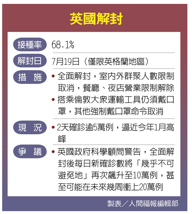 【本報綜合外電報導】英國英格蘭十九日全面解封。美國有線電視新聞網(CNN)報導,英國首相強森賭很大,連他自己也承認,解封可能使更多人死於新冠病毒。