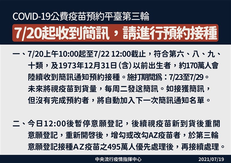 該系統平台自7月20日上午10時起,將針對第六、八、九、十類及1973年12月31日(含)以前出生民眾,約170萬人會陸續收到簡訊,預約接種期程至7月22日中午12時截止;本輪可接種疫苗為AZ疫苗,施打期間為7月23日至7月29日,籲請民眾準時前往接種。未來將視疫苗到貨量,每周二發送簡訊,提醒民眾預約接種。如接獲簡訊,但沒有完成預約者,將自動加入下一次簡訊通知名單。