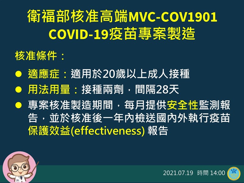 高端疫苗通過EUA 8月有望少量施打 |2021.07.19 語音朗讀 4808觀看次 字級 大 中 小 高端疫苗通過EUA,衛福部核准專案製造,8月有望少量供應施打。圖/總統府提供 【本報台北訊】中央流行疫情指揮中心今(19)日公布,本土新增15例確診、6境外,以及1死亡。疫情持續趨緩,國產疫苗還傳來好消息,指揮官陳時中表示,衛福部核准高端COVID-19疫苗專案製造,預計8月有少量疫苗供國人施打。高端疫苗於6月二期解盲成功,上周完成補件,衛福部食藥署昨日完成專家審查會議,通過高端新冠疫苗EUA(緊急使用授權Emergency Use Authorization)的申請,允許專案製造。對於高端疫苗何時投入施打行列,陳時中表示,因為高端才剛通過EUA,目前產能比較低,相關製程也正如火如荼進行中,數量的部分,還要等ACIP疫苗專家小組討論後,再放到計畫中,「8月應該能夠多少有一些少量的供應沒有問題。」圖/指揮中心食藥署長吳秀梅表示,食藥署於110年7月18日邀請國内化學製造管制、藥學、學、公衛、法律及醫學倫理專家召開會議,討論高端MVC-COV1901新冠肺炎專案製造申請案,經過充分的審查與討論鑑於高端疫苗的中和抗體數據已證明不劣於國人結果,中和抗體結果達成食藥署公告的新冠疫苗專製造或輸入技術性資料審查。吳秀梅表示,在高端疫苗組AZ疫苗組,原型株活病毒中和抗體幾何平均效價比值的95%信賴區間下限為3.4倍,大於標準要求0.67倍。食藥署依「藥事法第48條之2規定」,核准高端疫苗專案製造,適用於20歲以上成人之主動免疫接種,接種2劑,間隔28天,以預防新冠病毒。另針對專家會議建議,該疫苗於專案核准製造期間,藥商須每月提供安全性監測報告,並於核准後一年內檢送國內外執行疫苗保護效益(effectiveness)報告,以保障國人用藥安全。圖/指揮中心吳秀梅表示,審查會議與會專家21人,其中主席不參與投票,18人同意、1人補件再議、1人不同意。指揮官陳時中表示,這都是科學的審查結果,會盡快送到ACIP疫苗小組進行討論。除了高端疫苗外,聯亞生技六月底也已送件,但相關審查進度,食藥署長吳秀梅僅表示,聯亞疫苗送件了,積極審查中。 前一篇文章 第三輪預約AZ疫苗者明收簡訊 170萬人可接種 下一篇文章 易疲勞常掉髮? 可能蛋白質不足 吃這些植物最健康 熱門新聞 01【讓愛自由】纏繞與獨立之間2026.04.0202新生首次到校2026.04.0203星雲大師靈骨分燈泰國 化益世人2026.04.0204打字機重返課堂 對抗AI代寫2026.04.0205緬甸佛學院訪佛光山 深化教育弘法發展2026.04.0206日月潭蓄水率 跌破6成2026.04.0207租賃車業者違法攬客 觀光署:最高罰200萬元2026.04.0708睡足多運動常吃蔬菜 改善生活習慣促健康2026.04.0209徐若熙日職初登板 6局6K奪首勝2026.04.0210奧斯陸佛光童軍 體驗禪修學滑雪2026.04.02 訂閱電子報 台北市 天氣預報 台灣一週天氣預報 相關報導 鄭麗文今訪陸 預計4月10日晤習台澎海空疏運高峰 逾8千人提前返台海軍敦睦艦隊 進入巴拿馬運河中油高雄大林廠火警 環保局開罰桃機3航廈屋頂 設10公里天溝國民黨中常會 提名台中、澎湖、竹縣長