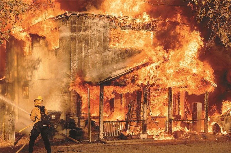 強風和熱浪助長美國加州野火。圖為拉森郡野火10日波及民宅,消防員灑水灌救。圖/美聯社