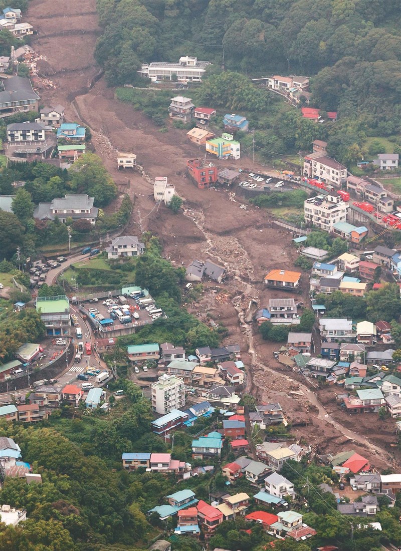日本靜岡縣熱海市降下豪雨後,在3日發生大規模土石流,房屋和車輛都被沖毀。圖/法新社