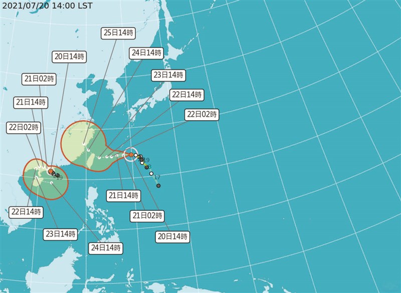 另據日本氣象廳預測路徑,烟花行進路徑持續朝西行進,二十三日上午九時中心位置在台灣東部外海,接著將朝西北西穿越北台灣,預計二十四日上午九時中心位置在台灣海峽。