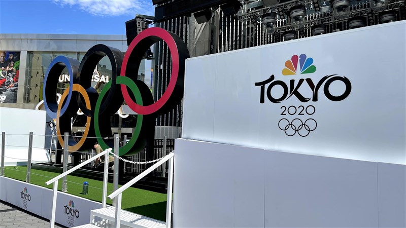 東京奧運7月23日開幕,美國轉播單位NBC在觀光景點設置奧運五環,宣傳賽事。圖/中央社