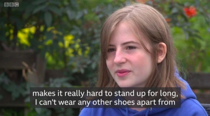 英國少女蘇菲亞,去年10月起受「新冠腳趾」所苦,無法穿鞋走路,但她從未被檢測出感染冠狀病毒。圖/取自BBC