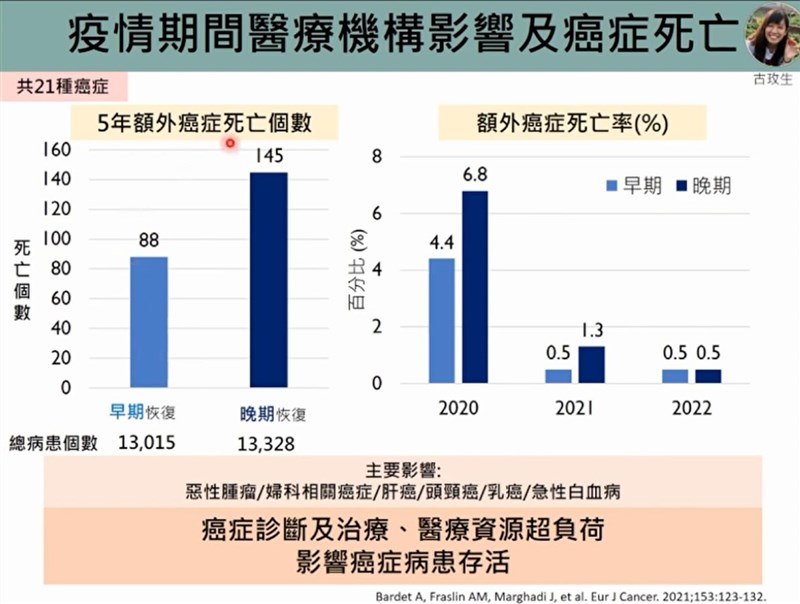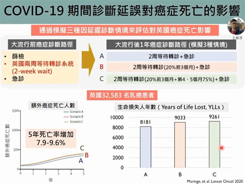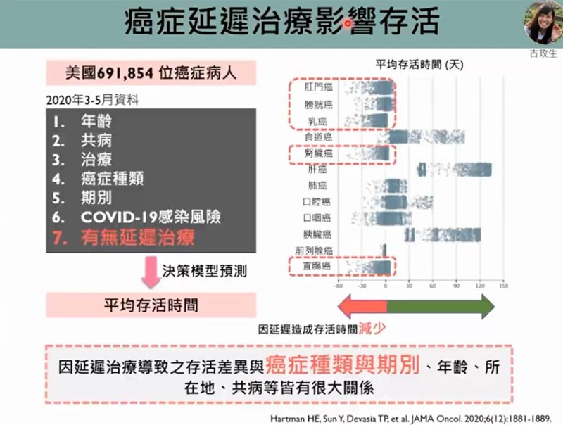 疫情牽累 10種癌最易延誤治療、死亡率升高 |2021.07.21 語音朗讀 1942觀看次 字級 大 中 小 圖╱unsplash 【本報台北訊】中央流行疫情指揮中心釋放出可能降級的訊息,民眾及業者都對於庶民經濟的復甦抱持期待。台大公衛流病與預醫所教授陳秀熙說,此時也應思考癌症及慢性病病人的治療是否也因疫情受到延誤,疫情期間病人對醫院的利用率減少,可能延誤早期治療,導致健康蒙受損失。公衛學者也根據英國、法國、美國之研究,治療最容易因疫情延遲的癌症包括婦科癌症、肝癌、頭頸癌、乳癌、血癌,因延誤治療而顯著減少存活的則為肛門癌、膀胱癌、乳癌、腎臟癌、直腸癌。公衛學者王威淳表示,英國去年針對9.4萬名需要手術的癌症患者進行追蹤研究,正常治療狀況下,每治療18人就可以讓人多活1年;延遲治療則會導致生命損失,延遲6個月治療,所損失的生命是延遲3個月的兩倍以上。王威淳指出,英國大流行前癌症診斷有3步驟,篩檢、兩周的等待轉診期、急診,學者透過模擬延遲診斷情境,評估疫情對於癌症死亡到影響。模擬結果顯示,根據等待轉診期被延誤的程度,英國3.2名乳癌患者損失的人年數可高達9033到9261人,5年死亡率增加7.9到9.6%,非常可觀。研究顯示,癌症治療會受到疫情延誤,進而減少存活。圖/擷取自新冠肺炎防疫科學線上直播不只是英國,法國研究也有類似發現。公衛學者古玫生表示,法國癌症研究中心探討疫情期間醫療機構所受的影響,以及對於21種癌症死亡的影響。結果發現,在2018年1月到2020年12月期間,有6到8%患者治療延遲超過兩個月,受到疫情影響最大的癌症包括婦科癌症、肝癌、頭頸癌、乳癌、血癌。隨著疫情恢復時機的早晚,5年內的額外癌症死亡個數可高達88到145人,額外癌症死亡率增加4.4到6.8%。研究顯示,癌症治療會受到疫情延誤,進而減少存活。圖/擷取自新冠肺炎防疫科學線上直播古玫生指出,在美國2020年3到5月6.9萬名癌症病人資料顯示,延遲治療導致存活差異與癌症種類和其別有很大的關係,年齡、所在地、共病、新冠肺炎感染風險等,都會有影響。其中,因延遲治療而顯著導致存活時間減少的癌症為肛門癌、膀胱癌、乳癌、腎臟癌、直腸癌。研究顯示,癌症治療會受到疫情延誤,進而減少存活。圖/擷取自新冠肺炎防疫科學線上直播 前一篇文章 烟花北轉 強度可達中颱上限 最快今晚發海警、明陸警 下一篇文章 用父母手尾錢買物資贈學校 嘉縣南新國小校長莊政道獲師鐸獎 熱門新聞 01【詩】與光行2026.01.1902【素人攝影】美夢成真 遇見幸福極光 2026.01.1803大陸絕美書店 奇幻閱讀旅程2026.01.1804小氣泡能量大2026.01.2005聯合國示警 全球水資源破產2026.01.2206星雲大師全集⑳【佛教管理學②】佛教的「梵唄音樂」管理學⑧2026.01.1807海洋音樂家 鯨魚神祕吟唱2026.01.1808大學學測 計算量大數學A近年最難2026.01.1809微細氣泡 用途也很多2026.01.2010抹香鯨 靠方言暸解親族關係2026.01.18 訂閱電子報 台北市 天氣預報 台灣一週天氣預報 相關報導 登中級山掀熱潮 輕忽風險事故多行銷台日旅遊 高捷彩繪輕軌高鐵南延屏東 須補強開發必要性屏東燈節 40組藝術燈飾明登場超人力霸王提燈亮相農業部:營建餘土 不得回填農地