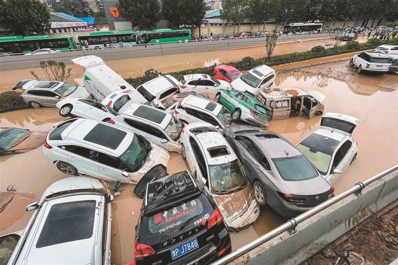 鄭州市內大量汽車被洪水沖走。圖/法新社