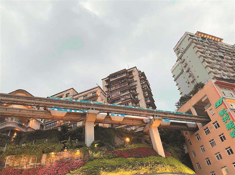 有山城之稱的重慶,因地貌關係,人們在當地交通常需上天入地。其中,二○○五年建成的李子霸輕軌站,位於重慶市渝中區一棟居民宅的六至八樓,是全線唯一的「樓中站」,早已成為城市標記。