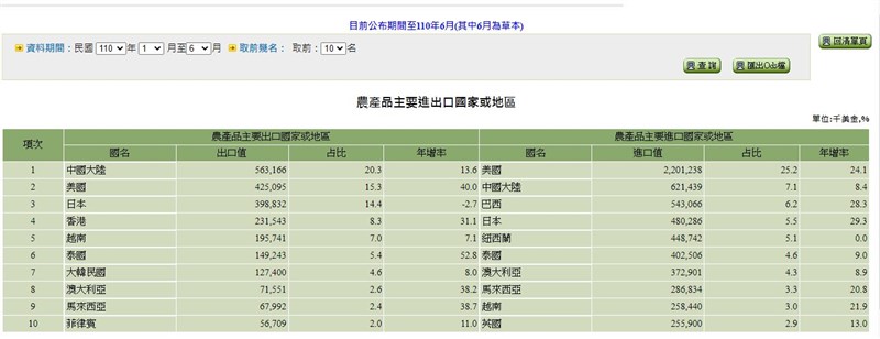 根據農業貿易統計顯示,我國農產品出口前十大國家地區中,大陸持續蟬聯第一,出口值5億6316萬6000美元,占我國農產品總出口值的20%;排名第二的美國占15.3%、排名第三的日本占14.4%,但美國比去年同期增長40%,日本卻衰退2.7%,其餘國家權增加;而我國的農產品進口國家地區,則以美國最多占25.2%,和去年同期相比增加24.1%;大陸則占了7.1%排名第二。