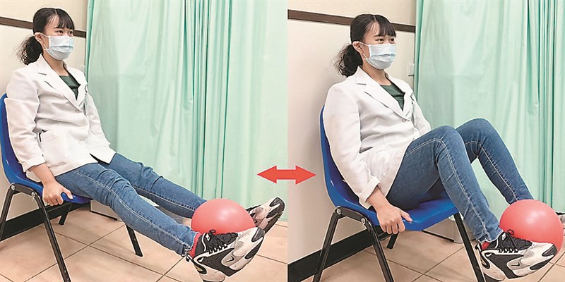 她建議三項簡易的下肢運動,第一招先坐好,把拉力球或枕頭夾在大腿間,兩腿用力往內夾,藉此訓練大腿內收肌,克服爬樓梯或跨坐機車時的困難;第二招一樣坐姿,將拉力球放在膝蓋後側的大小腿間,小腿用力往後夾然後撐住,訓練大腿後側肌力。
