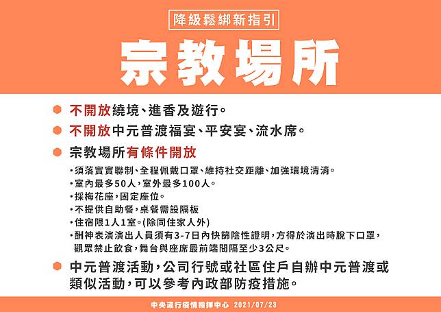 7/27-8/9降二級警戒 宗教場所參拜微解封 社區可普度不聚餐 |2021.07.23 語音朗讀 9032觀看次 字級 大 中 小 指揮官陳時中表示,7月27日起到8月9日起降級到二級警戒。圖/取自疫情中心直播7/27-8/9降二級警戒,開放普度公祭,不可遶境進香。圖/資料照片宗教場所。圖/指揮中心提供 【本報台北訊】中央流行疫情指揮中心宣布,7月27日起至8月9日調降疫情警戒標準至第二級,普度、公祭、婚宴及宗教場所、幼兒園、課照中心、補習班、托嬰中心、失智據點、美容美體業等,符合各部會規定可開放。除了飲食外,外出全程配戴口罩,以及開放室內50人、室外100人集會活動。此外,我國今日新增24例確定病例,分別為23例本土及1例境外移入;確診個案中新增2例死亡。指揮官陳時中表示,7月27日起到8月9日起降級到二級警戒,但是全球風險增高中,很多國家解封後,或是疫苗打到一定程度,放寬管制也都造成相當大的疫情。陳時中強調,防疫疲乏要注意,管制等級才管得著。提高警覺,不排除任何時候改變警戒情況,我們當然不希望,但是疫情在世界看來是多變的,要提高警覺。陳時中說,調降至二級還是要戴口罩,社交距離、實聯制,包括每人2.25平方公尺,及室內50人、室外100人上限,超過人數須要提出計畫。餐飲比照微解封,室內還是要有隔板,維持社交距離。許多民眾關心宗教活動開放,中央流行疫情指揮中心副指揮官陳宗彥說,7月12日起適度鬆綁後,大家都很關心中元普度,除了落實人流管制規定,現在遶境進香遊行還是不開放,中元普度後的福宴、平安宴也不開放,公司行號或是社區自己辦的中元普度,都可以參考防疫措施。陳宗彥說,其他宗教場所依照室內50人、室外100人的方式,依照場所位置做梅花座等,落實實聯制、保持社交戴口罩,都是最基本的部分。有些宗教場所活動或禪修完成會有供餐,暫不提供自助餐,桌餐要設隔板。酬神演出人員演出,要依照文化部的指引進行,要有3日內快篩,舞台間隔3公尺。陳宗彥說,公祭的部分,殯葬場所一樣大原則,室內50人、室外100人,採取梅花座,因各縣市殯儀館禮廳大小不一,要考慮規模大小,請各縣市訂定因應個禮廳、靈堂的規範,避免同一時段有過多人留在外群聚,請各縣市訂定人數上限。要請各級機關與民代配合,不參加公祭與普度,作為防疫表率,請各級行政機關首長與公務員民代等配合措施。桃園市南坎五福宮延續百年以上的中元盂蘭盆法會普度民俗,傳承古早民俗文化。圖/資料照片婚宴開放,禁止換桌逐桌敬酒,內政部有相關規定處理,原則還是以50、100人的規定辦理。婚宴每一個隔間50人,室外100上限,不要逐桌敬酒,我們有習慣的逐桌敬酒,希望統一在台上敬酒,符合主管機管管理的有詳列出來。至於仍須關閉的場所,包括酒家、酒店、酒廊或錄影MTV、KTV或遊樂場、桌遊館、麻將館等休閒娛樂,K書中心等場所維持不開放。中央流行疫情指揮中心今(23)日表示,考量國內疫情及參酌其他國家之防疫調整經驗,並經與各地方政府進行溝通討論後,指揮中心自7月27日至8月9日調降疫情警戒標準至第二級,各部會得依指揮中心所發布之通案性原則另訂指引,而各地方政府亦得在此原則下,視疫情需要而有調整空間,惟相關指引必須規範明確以利民眾遵循。說明如下:一、通案性原則:1. 除飲食外,外出全程配戴口罩。2. 確實執行實聯制登記措施。3. 保持社交安全距離。4. 營業場所及公共場域人流控管或總量管制:室內空間至少1.5米/人(2.25平方米/人),室外空間至少1米/人(1平方米/人)。5. 集會活動人數上限:室內50人,室外100人,若超額則提防疫計畫。6. 餐飲內用原則依照衛福部規定處理。二、婚宴、公祭可開放:1. 公祭遵守內政部相關防疫規定處理。2. 婚宴遵守每一隔間室內50人、室外100人上限,並遵守餐飲指引不得逐桌敬酒。三、仍須關閉之場所:1. 休閒娛樂場所:歌廳、舞廳、夜總會、俱樂部、酒家、酒吧、酒店(廊)、錄影節目帶播映場所(MTV)、視聽歌唱場所(KTV)、理容院(觀光理髮、視聽理容)、遊藝場所、電子遊戲場、資訊休閒場所、休閒麻將館、桌遊場所及其他類似場所。2. 教育學習等場域:社區大學(開放受理秋季班報名,實體課程不開放)、樂齡學習中心、K書中心、游泳池等其他類似場所。指揮中心表示,今日新增之23例本土病例(其中11例為居家隔離期間或期滿檢驗陽性者),為19例男性、4例女性,年齡介於20多歲至50多歲,發病日介於今(2021)年7月10日至7月22日。個案分布以新北市13例為最多,其次為臺北市及桃園市各4例、宜蘭縣及高雄市各1例;其中18例為已知感染源,餘5例關聯不明,將持續進行疫情調查,以釐清感染源。 前一篇文章 對抗Delta 澳洲12至15歲可打輝瑞疫苗 下一篇文章 「抗癌之王」蘆筍是外國菜 挑選及保存撇步 熱門新聞 01動物的精采瞬間(上)2026.02.0802台北書展 佛光山拉近佛與讀者距離 看得懂用得著 佛教徒必讀經典重磅獻禮2026.02.0703斯里蘭卡獨立節 佛光人至駐菲大使館同賀2026.02.0704台北書展對話 佛光山安定動盪人心2026.02.0805健康瘦身, 遠離糖尿病!2026.02.0706台北書展 佛光山拉近佛與讀者距離 文心雕佛問世 楊渡、許悔之、廖玉蕙遇見佛 2026.02.0707後備軍人教召 改為14天2026.02.0708星雲大師全集⑳【佛教管理學③】弘法系列人事篇 人事管理法①2026.02.0709福山寺送暖 福田戶投鉢植福2026.02.0710日月潭神祕黑洞2026.02.08 訂閱電子報 台北市 天氣