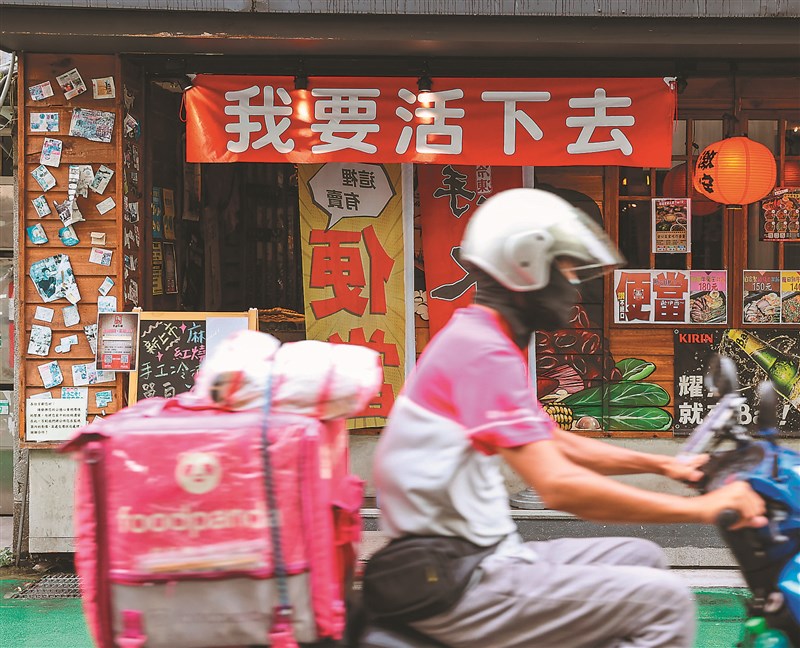 受疫情衝擊,6月餐飲業營業額僅達383億元,創歷年同月最大衰退幅度。圖為台北市1間餐廳掛出紅布條,表達在疫情下奮力拚搏的心聲。圖/中央社