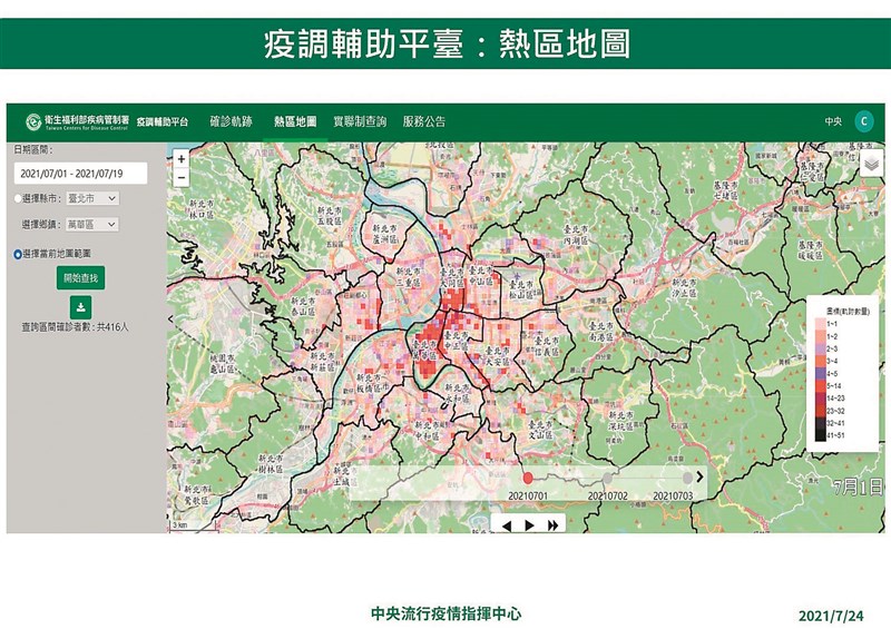 簡宏偉說,為方便地方政府掌握確診者跨縣市流動的情形,也提供各地方政府可進行跨區調閱,也可經由分析確診者足跡,產出區域的軌跡熱力圖,提供可能群聚的足跡分布、潛在感染源分析及多確診者足跡分析等資訊,並以動態方式呈現,以利疫調人員觀察熱區趨勢。