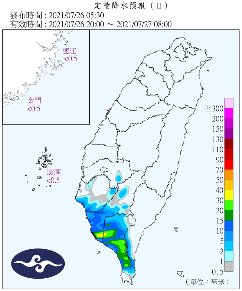 吳德榮說,今、明(26、27日)兩天南部有局部陣雨或雷雨,並擴展至中部,有較大雨勢,應注意,午後北台灣山區亦有對流發展的機率。背風面北部、東半部則是高溫、酷熱,最高溫可達38度以上,要注意防晒、防中暑,今日各地氣溫:北部25至38度,中部26至35度,南部25至34度,東部24至39度。
