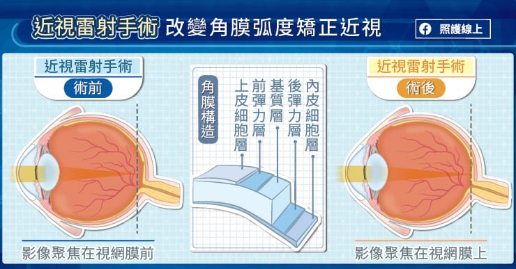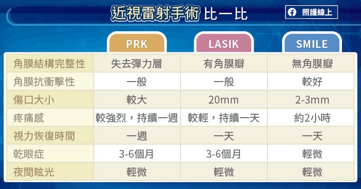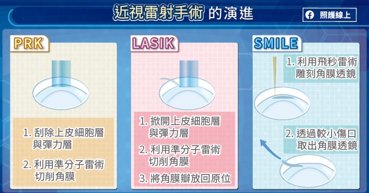 近視雷射手術 PRK、LASIK、SMILE有何差別? |2021.07.26 語音朗讀 707觀看次 字級 大 中 小 台灣近視比例相當高,在18歲的青少年中,近視比例高達87%,甚至有35%為超過500度之高度近視。圖/unsplash 【本報台北訊】眼科專科醫師張聰麒指出,近視的成因是眼軸變長,導致影像聚焦在視網膜之前,而變得模糊。為了矯正近視,必須從光學原理著手,常見的方法是配戴近視眼鏡,讓影像清楚聚焦在視網膜上;另一個方法是透過改變角膜的弧度,因為角膜具有屈光的效果,所以能夠利用角膜塑型片暫時改變角膜弧度或以雷射手術改變角膜厚度來調整焦點。圖/unsplash想了解近視雷射手術,得先認識角膜的構造。角膜的構造分為幾層,由外而內分別是,上皮細胞層(epithelium)、前彈力層(Bowman's membrane)、基質層(stroma)、後彈力層(Descemet's membrane)、及內皮細胞層(endothelium)。張聰麒醫師分析,上皮細胞層佈滿神經末梢,對觸覺、痛覺非常敏感,即使是一顆沙粒都會讓人極為不適;基質層是角膜的主體,約占角膜厚度的九成;前彈力層與後彈力層好比角膜的上蓋與地板,是角膜最堅韌的構造。上皮細胞層、後彈力層、內皮細胞層具有修復再生能力,而基質層、前彈力層無修復再生能力。從1980年代開始,準分子雷射便被應用於矯正近視,經過多年發展,近視雷射手術有許多演進,目前臨床上較常見的有PRK、LASIK、與SMILE等近視雷射手術。PRK雷射屈光角膜切削術PRK(雷射屈光角膜切削術,Photo Refractive Keratectomy)是較早期的作法,張聰麒醫師解釋,手術中會先用酒精溶解上皮細胞層與彈力層,再小心刮除,然後利用準分子雷術切削角膜,達到計畫的厚度。PRK雷射屈光角膜切削術會破壞較多上皮細胞層,由於上皮細胞層相當敏感,所以術後痛感較明顯,大約會持續一週,視力才漸漸回復,張聰麒醫師解釋,接受PRK術後,前彈力層與基質層不會再生,上皮細胞層則會慢慢長回來,為了避免形成疤痕組織,需要每天使用類固醇眼藥水約半年,以降低出現白斑增生的機會。LASIK雷射屈光角膜層狀重塑術LASIK(雷射屈光角膜層狀重塑術,Laser Assisted in Situ Keratomileusis)在1990年代發展出來,張聰麒醫師說明,LASIK的手術步驟是先製作角膜瓣將上皮細胞層與彈力層掀開,然後使用準分子雷術切削基質層,達到計畫的厚度後,將角膜瓣蓋回去。過去得靠手工切割製作角膜瓣,現在大多是電腦製辦,可以提升穩定度及準確度。做完LASIK後,疼痛感較輕,大約持續一天,視力可較快回復。接受LASIK手術後不需使用類固醇眼藥水,但是乾眼症的狀況會持續3~6個月。日常生活中還得特別留意角膜瓣的狀況,張聰麒醫師提醒,放回原位的角膜瓣,無法緊密癒合,在經過多年之後,還是可以再掀開來,日常生活中的碰觸、撞擊、揉眼睛都可能導致角膜瓣位移。圖/unsplash「臨床上角膜位移的案例並不少見,曾經有位白內障患者於十年前開過LASIK近視雷射手術,但在進行白內障手術的過程中,器械稍微碰到角膜瓣的邊緣,角膜瓣就掀開了。」張聰麒醫師分享,「我們小心地將角膜瓣蓋回去,隔天檢查視力依舊是1.0。」SMILE微創角膜透鏡萃取術SMILE(微創角膜透鏡萃取術,SMall Incision Lenticule Extraction)的發展讓近視雷射手術朝微創手術的方向前進,張聰麒醫師說,SMILE使用能量較低的飛秒雷射於基質層精準雕刻出一個角膜透鏡,然後透過一個2~4公厘的小傷口取出角膜透鏡。相較於PRK、LASIK,SMILE的傷口小很多,疼痛感也較少,術後隔天就不太會痛。在視覺品質的部分,SMILE的恢復較快,術後幾個小時大概可恢復到0.8~0.9的視力,到了隔天大約80%的人可以恢復到1.0的視力。值得注意的重點是,SMILE的傷口較小,能夠維持前彈力層大致完整,張聰麒醫師比喻,前彈力層與後彈力層是整個角膜最堅韌的構造,就像是角膜的上蓋與地板,由於PRK會溶解前彈力層、LASIK則會掀開前彈力層,皆影響角膜的強度,SMILE則可以保留前彈力層,有助維持角膜的強度。SMILE微創角膜透鏡萃取術的缺點是手術難度較高,因為屬於微創手術,相當仰賴醫師的技術與經驗,張聰麒醫師分析,LASIK雷射屈光角膜層狀重塑術是將整個角膜瓣翻開,而且經過長期發展,許多步驟已可自動化,至於SMILE是透過幾公厘的開口進行手術,目前仍需手工操作,對醫師的技術要求就很高。貼心小提醒經過數十年的累積,近視雷射手術持續演進,希望可以減少疼痛、減少併發症、並達到更好的視覺品質。張聰麒醫師提醒,無論是早期的PRK、LASIK,到現在的SMILE手術,醫師會在完整的評估後給予合適的建議。從術前準備、到術後照顧,請務必與醫師密切配合,才能達到較理想的手術結果!本文由「照護線上https://www.careonline.com.tw/」授權轉載。原文出處:https://www.careonline.com.tw/2021/07/smile.html原文標題:近視雷射手術比一比,PRK、LASIK、SMILE有何差別?眼科醫師圖解說明 前一篇文章 最新研究 1杯咖啡 降3%心律不整風險 下一篇文章 新冠侵入腦神經 後遺症待觀察 熱門新聞 01【詩】啤酒與冰淇淋 2026.02.2702動物的精采瞬間(下)2026.02.2203佛光山平安燈會 逾百萬人朝聖2026.02.2304【詩】紅豆控的紅龜粿2026.02.2305紐西蘭佛光山迎新春 總理盧克森同樂2026.02.2306守護相遇的初心2026.02.2207川普替代方案 加徵全球10%關稅2026.02.2208發現世界最早花椒?2026.02.2509【遇見荷】眠夢風吹雪2026.02.2510台北道場行春 蔣萬安為市民祈福2026.02.26 訂閱電子報 台北市 天氣預報 台灣一週天氣預報 相關報導 水溶性