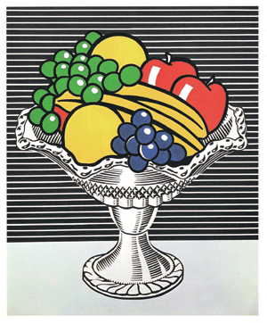 「水晶托盤靜物」(附圖)是美國普普藝術家李奇登斯坦(Roy Lichtenstein)的作品,他以紅酖綠及黃酖紫,雙補色對為主,黑酖白為輔,將眼前的水果靜物,結構出一種簡約、清晰,略帶廣告和印刷手法的視覺經驗,演繹出美國式大都會的消費文明,將普普藝術推向另一個高峰。