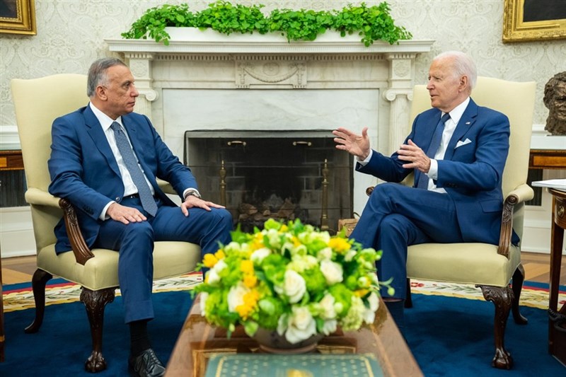美國總統拜登(右)26日和伊拉克總理哈德米(左)展開會談,並表示美國在伊拉克的戰鬥行動將終止。圖/中央社