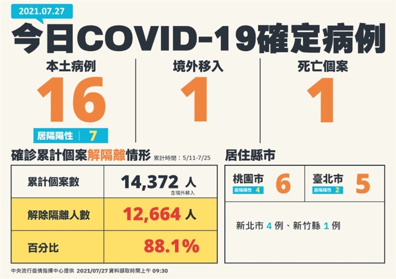 新增16例! 疫情有效控制 今有58萬劑AZ抵台 |2021.07.27 語音朗讀 1500觀看次 字級 大 中 小 截至26日,台灣接種疫苗人次為29.5萬人次,人口涵蓋率達28.74%。圖╱中央社 【本報台北訊】國內新增16例本土及1例境外移入COVID-19確定病例,另確診個案中新增1例死亡。中央疫情指揮中心指揮官陳時中表示,目前1名疫調中,4例關聯不明,目前來說大致縣市別比較集中,染疫都有些脈絡可循,都靠地方政府更努力用疫調平台串連起來,疫情還算有控制住。今天下午將有另一批AZ疫苗、約58.2萬劑抵台,目前到貨疫苗總計948.46萬劑。陳時中表示,這批AZ疫苗預定於今日下午3時40分抵達桃園國際機場,待完成通關程序後,直接運送至指定冷儲物流中心進行後續檢驗封緘作業,再提供接種計畫所列實施對象接種。陳時中說,這批疫苗為我國和AZ公司自購的疫苗,先前於3月3日到貨11.7萬劑、7月7日62.6萬劑、7月15日56萬劑,本次提供第4批疫苗58.2萬劑,截至目前總計約188.5萬劑到貨。本次提供之疫苗係為多劑型包裝,每瓶10人份,需存放於攝氏2至8度的環境,依臨床試驗每人需施打2劑,本批效期至2021年11月30日。而我國接種疫苗人次昨天為29.5萬人次,人口涵蓋率達28.74%、劑次人口比為29.98%。北市國高中教職員,於花博大型接種站接種疫苗。圖╱中央社指揮中心表示,今日新增之16例本土病例(7例居隔解陽),為11例男性、5例女性,年齡介於30多歲至60多歲。個案分布桃園市6例、台北市5例、新北市4例、新竹縣1例。指揮中心說明,今日新增1例死亡個案(案8354),為70多歲男性,有慢性病史,無相關活動接觸史,5月28日出現呼吸困難等症狀,5月29日就醫採檢並收治住院,5月31日確診,7月24日死亡。指揮中心指出,5月11日至7月25日累計公布1萬4372位確診個案中,已有1萬2664人解除隔離,解隔離人數達確診人數88.1%。圖╱指揮中心 前一篇文章 疫苗意願登記重啟 滿20歲可選高端疫苗 下一篇文章 富國每百人打95劑窮國僅1.5劑 世銀奧援 熱門新聞 01與精品品牌撞鞋 印度涼鞋打專利戰2025.12.2102佛光山高雄佛教堂 營建工地評鑑特優2025.12.1903太陽瓶燈泡 點亮貧困家庭希望 2025.12.1904【時光重逢】花宅海邊美術館2025.12.1905邂逅佛教 安頓身心2025.12.2106北島佛光山獲四星肯定 園林躍升具重要意義庭園2025.12.1907銀杏點亮.東京印象2025.12.2308【動物奧斯卡獎】猜猜誰最會演(上)2025.12.2109日球星率道奇連霸 2025體壇最驚奇 2025.12.1910社論--瞋恨的危害2025.12.21 訂閱電子報 台北市 天氣預報 台灣一週天氣預報 相關報導 最強戰車上街頭 M1A2T首次戰備偵巡中選會主委 政院提名游盈隆鄭麗文訪佛光山 找到歡喜信心全台首座螺旋圓環憲訴法修正案 憲法法庭判違憲吳豊山辭海基會董座 賴聘任資政