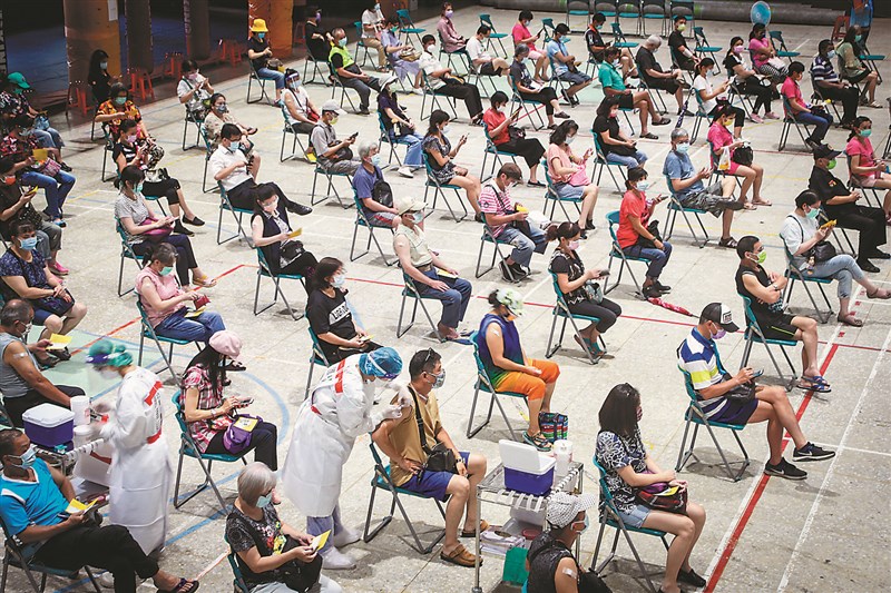 新冠疫苗逐步到貨,國內接種作業持續進行,昨日新北市一處大型施打站持續有許多民眾到場接種疫苗。圖/中央社