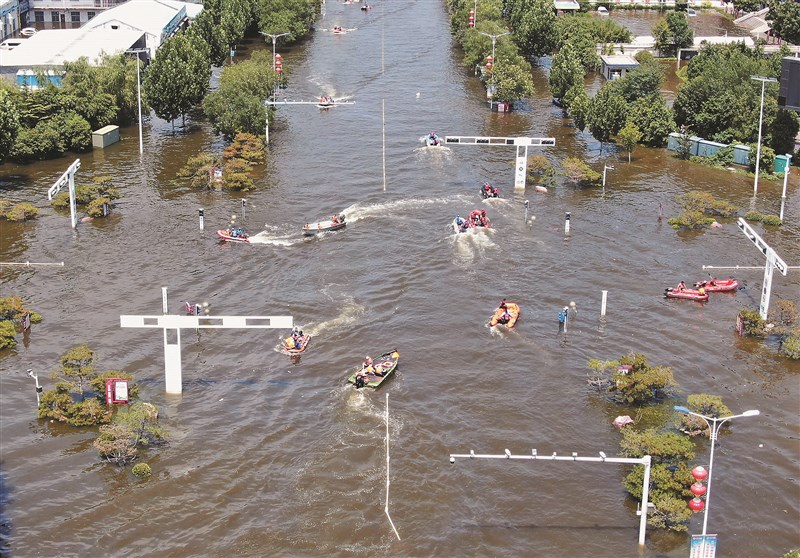 大陸河南省衛輝市因暴雨致災,救援人員26日在洪患地區疏散人們時,全體乘船通過十字路口。圖/美聯社