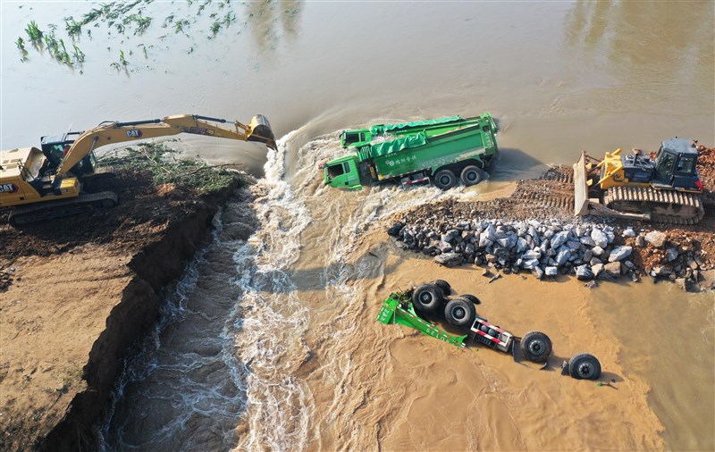 滿載石料的重型卡車,被水淹入衛河鶴壁市浚縣新鎮鎮彭村段的決口處。圖╱新華社