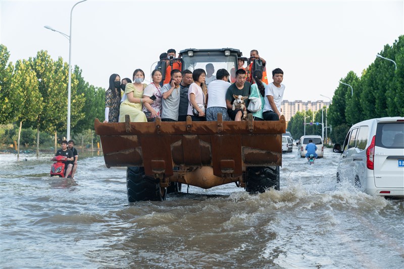 河南鄭州日前因大雨導致部分地區淹水,一名鏟車司機以鏟斗協助民眾脫困。圖/新華社