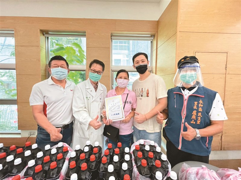 許秀卿(中)帶著二百份仙草茶、二百份仙草凍到耕莘醫院,希望讓醫護人員消暑一下。圖/盧燕山提供