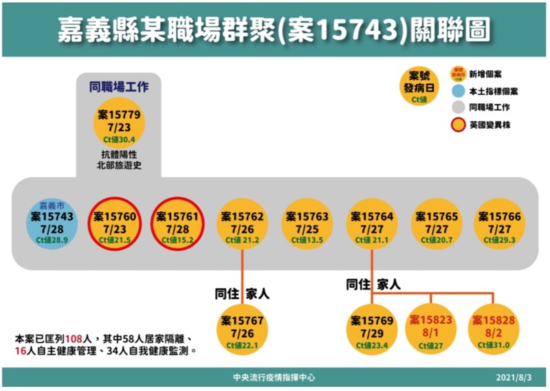 嘉義爆發職場群聚事件,除了原本9名職場感染、2名延伸家庭群聚的11人染疫,經過2天後,今日再新增2名確診個案,陳時中表示,新增兩名案15823、案15828,身分分別是小孩與長輩,目前已經採檢108人,其中陰性96人、陽性12人,採檢已經告一段落,病毒定序是英國株,沒有特殊情況,目前情況樂觀,希望盡快告一段落。
