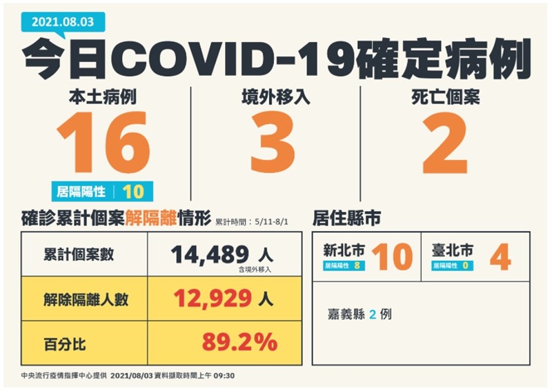 指揮中心表示,今日新增之16例本土病例(10例居隔解陽),為9例男性、7例女性,年齡介於未滿5歲至70多歲。個案分布新北市10例、台北市4例、嘉義縣2例;其中13例為已知感染源、2例關聯不明,1例疫調中,將持續進行疫情調查,以釐清感染源。