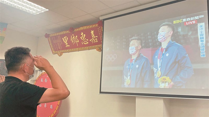 金門籍的羽球好手李洋與搭檔王齊麟日前拿下東京奧運羽球男雙金牌,金門縣長楊鎮浯(左)在觀看頒獎典禮時,向他們舉手致敬。