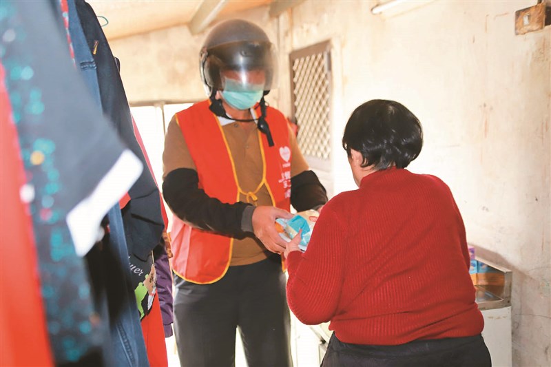 疫情期間,蘇清和(左)仍竭盡所能,把熱騰騰的飯菜送到獨居老人手中。圖/中華聖母基金會提供