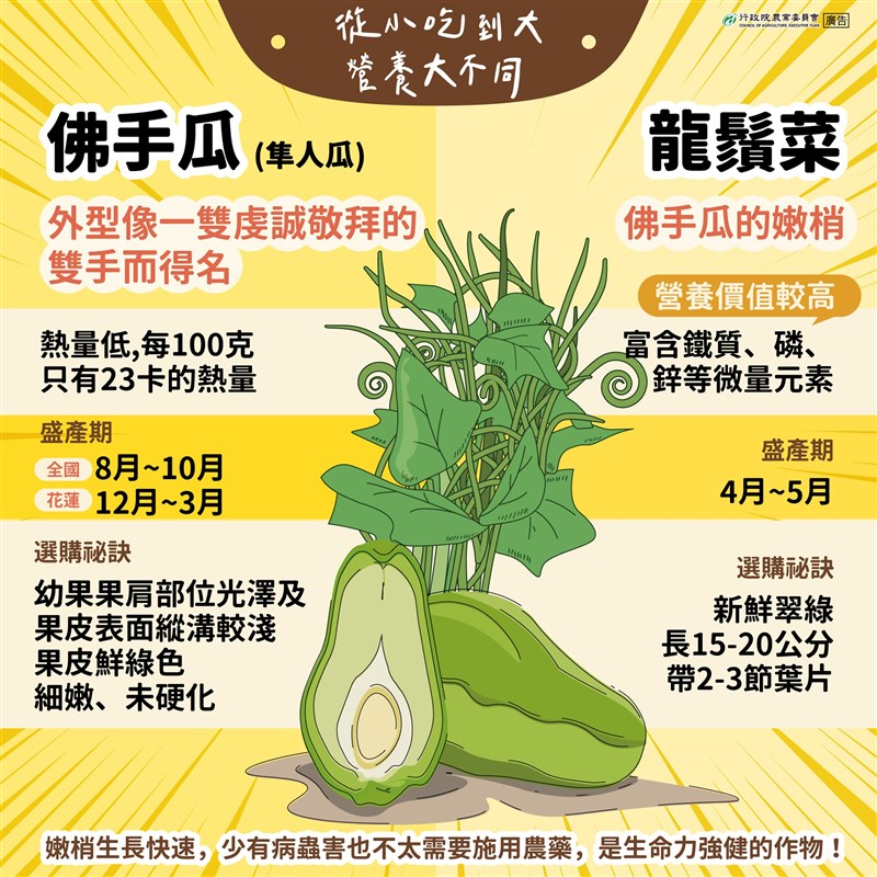 預防失智龍鬚菜、佛手瓜 原來是同一種作物 |2021.08.04 語音朗讀 3737觀看次 字級 大 中 小 圖/行政院農業委員會臉書 【本報台北訊】你吃過龍鬚菜,那有吃過佛手瓜嗎?其實佛手瓜跟龍鬚菜是同一種作物,佛手瓜為果實,龍鬚菜則是佛手瓜的嫩梢部位,因為口感好吃、鋅含量高,有助預防失智症,因此常常出現在台灣人的餐桌上。多吃龍鬚菜 有助預防失智症龍鬚菜。圖/123RF根據行政院農業委員會臉書的介紹指出,富含鐵質、磷、鋅等微量元素的龍鬚菜盛產期在4月~5月,盛產地則在花蓮地區,選購祕訣要挑新鮮翠綠、長15~20公分且帶2~3節葉片。龍鬚菜生命力強健,生長十分快速,種植時比較沒有病蟲害也不太需要施用農藥,是一種健康又美味的蔬菜!常見的料理方式有涼拌及熱炒等,簡單料理即可上桌!有研究發現,老年失智症患者,體內維生素A、B12、E及礦物質鋅等相對缺乏。龍鬚菜的鋅含量在蔬菜裡名列前三位,多吃有助預防失智症。佛手瓜佛手瓜(龍鬚菜的果實)圖/資料照片佛手瓜是因為外型像一雙虔誠敬拜的雙手而得名,也有一部分人稱之為隼人瓜。行政院農業委員會介紹指出,全國盛產期在8月~10月,選購的秘訣是要挑選幼果果肩部位光澤及果皮表面縱溝較淺者,並且果皮是鮮綠色、細嫩、未硬化,吃起來會更加美味!炎熱夏天很適合吃佛手瓜,可做成涼拌菜。也可以跟雞丁、紅椒等食材一起快炒食用。根據維基百科介紹,佛手瓜亦含豐富營養,每千克鮮瓜中含蛋白質5克、脂肪1克、纖維素30克、碳水化合物77克,還含有維生素C220毫克,核黃素0.1毫克,含鈣500毫克、磷320毫克、鐵40毫克。 前一篇文章 紐約開先例 到餐廳進健身房要出示疫苗接種證明 下一篇文章 健身房確診者足跡不斷 星國器材放室外韓國禁快跑 熱門新聞 01【閃文集】 駝峰天使2025.11.0402父親的山水2025.10.3103佛光會送家具至光復 助受災戶重建家園2025.10.3104魏碧糈 用茶講心教品德2025.11.0105印尼佛教大學教職員 佛光山佛學院培訓 2025.10.3106【遇見荷】 呼喚你的名字2025.10.3107【營養專欄】破解糖尿病飲食4大迷思2025.11.0108【墨香流韻】一筆清香 一念無塵 梅適情2025.11.0209梵蒂岡跨宗教對話60周年 教宗喜會中華人間佛教代表2025.10.3110社論--新台幣改版2025.10.31 訂閱電子報 台北市 天氣預報 台灣一週天氣預報 相關報導 中興新村活化 省主席官邸變身餐廳翡翠水庫支援發電 台電須付補償費林信義:台灣於APEC能見度提升國軍裝備採購 證實5案延宕鄭麗文:讓國民黨羊群變獅群APEC林信義進場與國旗同框