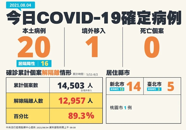 指揮中心表示,今日新增之20例本土病例(16例居隔解陽),為9例男性、11例女性,年齡介於20多歲至70多歲,發病日介於7月24日至8月3日。個案分布新北市14例、台北市5例、桃園市1例;其中16例為已知感染源、4例關聯不明將持續進行疫情調查,以釐清感染源。