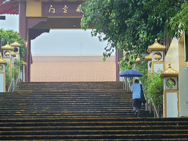 8月1日重新開放第一天,雖然下著大雨,仍有遊客即使撐著傘也要到佛光山。圖/人間社記者李生鳳