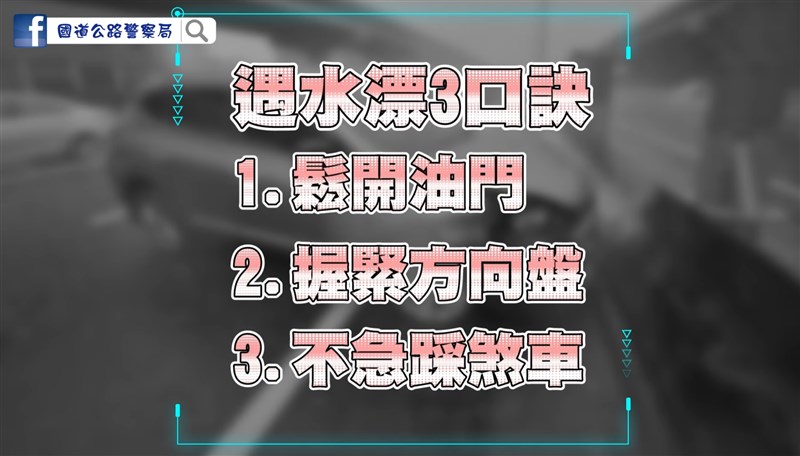 【本報新北訊】中央氣象局近期屢屢發布豪大雨特報,尤其中南部已被致災性暴雨襲擊多次,國道公路警察局特別提醒用路人,大雨之中行駛高速公路,一定要「放慢車速拉大車距」、慎防水漂效應,粉絲專頁並用實際案例製作教學影片,教大家應變之道,救命口訣就是:「鬆開油門、握緊方向盤、不可急踩煞車」。