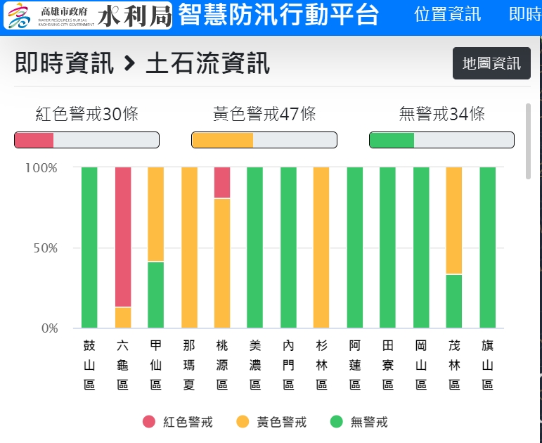 另依據高雄氣象站資料,茂林區3小時累積雨量104.5毫米、六龜達108毫米。水利局「水情e點零」資訊顯示,目前全高雄市有30處土石流紅色警戒區,其中27處集中六龜區、另3處位在桃源區;甲仙、那瑪夏、杉林、茂林等地有47條土石流黃色警戒區。