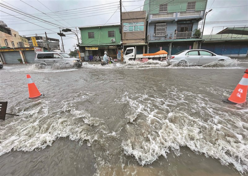 屏東縣大仁科大前道路及店家都淹水,經過車流如同陸上行舟。圖/劉學聖