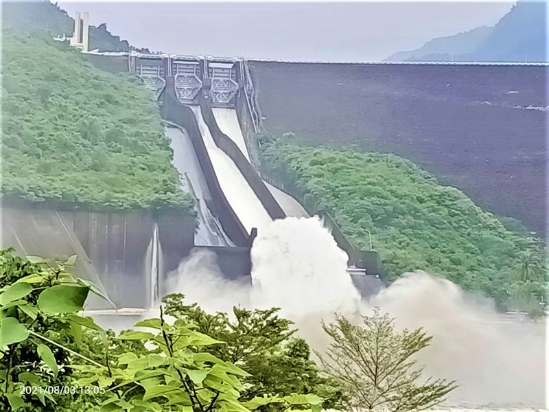 曾文水庫因應8月豪雨事件,從2日下午5時啟動調節性放水、最高時3道閘門全開,每秒達到900立方公尺,加大放流力道,4日上午11時才關溢洪道,加大防淤隧道排水量,持續至今已放水8千550萬立方公尺。這是曾文水庫2年來再度進行調節性放水,3道閘門全開氣勢滂沱也吸引不少遊客前往觀看。