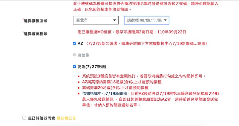 疫苗意願登記加入高端疫苗為選項者,有望在第六輪施打。圖/截自預約平台