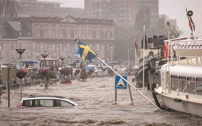 受極端氣候影響,歐洲上月豪雨成災。圖為比利時列日的默茲河水上漲,漫進市區。