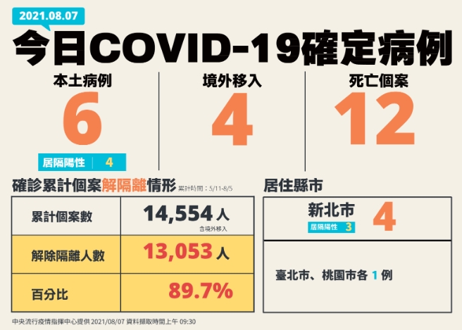 指揮中心指出,5月11日至8月5日累計公布1萬4554位確診個案中,已有1萬3053人解除隔離,解隔離人數達確診人數89.7%。