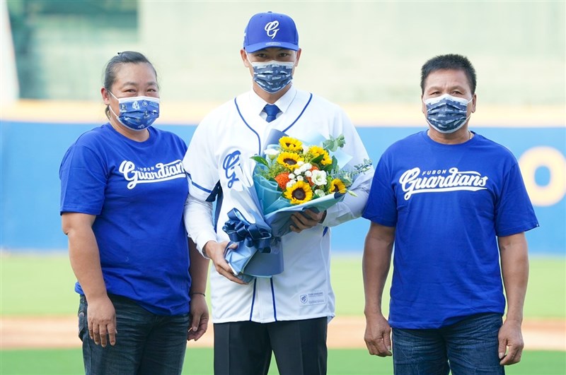 江少慶(中)的父母遠從花蓮來參加兒子的加盟儀式。圖/富邦悍將隊