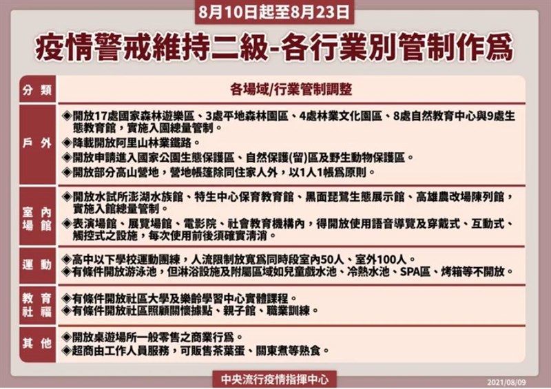 維持二級警戒至8/23 開放場所規範一次看 |2021.08.09 語音朗讀 3565觀看次 字級 大 中 小 疫情二級警戒維持至8/23,游泳池有條件開放了。圖/中央社 【本報台北訊】隨著國內本土確診數趨緩,中央流行疫情指揮中心今(9)宣布,自10日至23日維持疫情警戒標準為第二級,經與相關單位溝通討論及評估後,再開放部分場館,像是游泳池、社區大學等,至於八大場所仍不開放。指揮中心指揮官陳時中表示,社區大學、樂齡學營中心、社區照顧關懷據點、親子館與桌遊場所(一般民眾仍不能進去,限一般零售交易),符合主管機關防疫管理皆可開放;至於游泳池職業訓練等,要依據防疫指引方式開放;超商販售茶葉蛋、關東煮部分,只要有專人幫忙拿,或是已經包好的,不共用夾子,就可以販售。副指揮官陳宗彥指出,二級狀況維持下,戶外場域包括內政部所屬國家公園,交通部所屬風景區,農委會的森林遊樂區等。圖/指揮中心他指出,這次將開放國家公園生態保護區、森林園區內的自然保留保護區野生動物保護區;高山營地可以彈性開放,讓人一人一帳,或是同住家人可以同一帳,營內帳蓬間要維持一定的社交距離。指揮中心說明,目前國內疫情已在可控範圍,為兼顧防疫與民眾的生活品質,未來將持續觀察疫情態勢,循序漸進,適度放寬管制措施;面對病毒變異株的威脅,將持續強化邊境監測及防疫作為,阻絕病毒於境外。圖/指揮中心維持二級相關規範1. 除飲食外,外出全程戴口罩。2. 實聯制、保持社交安全距離。3. 營業場所及公共場域人流控管或總量管制:室內空間至少1.5米/人(2.25平方米/人),室外空間至少1米/人(1平方米/人)。4. 集會活動人數上限:室內50人,室外100人,若超額則提防疫計畫。5. 餐飲內用原則依照衛福部規定處理。6. 婚宴、公祭可開放:(1) 公祭遵守內政部相關防疫規定處理。(2) 婚宴遵守每一隔間室內50人、室外100人上限,並遵守餐飲指引不得逐桌敬酒。7. 超商由工作人員服務可販售茶葉蛋、關東煮等熱食。8. 符合主管機關防疫管理得開放:社區大學、樂齡學習中心、社區照顧關懷據點、親子館、桌遊場所(限一般零售交易)、游泳池、職業訓練等。 前一篇文章 滑椅子撞按鈕害核二跳機 犯最低級錯誤懲處總經理層級 下一篇文章 疫苗告急!397萬人「非莫不打」 陳時中:先滿足第一劑涵蓋率 熱門新聞 01水晶物理性 與化學性質2026.03.1702北美最乾燥加州死谷 罕見繁花錦簇2026.03.1803大馬急轉彎 撤回美對等貿易協議無效說 2026.03.1804店貓上班摸魚睡翻 萌樣逗樂網友2026.03.1805【歷史點滴】走過百年 高雄橋頭糖廠2026.03.1806美海軍引進機器人 爬牆維修艦艇2026.03.1907【大江南北】哈爾濱呼蘭天主教堂2026.03.1808【分享時刻】某些愛2026.03.1809澎湖食農教育 向下扎根2026.03.1910草間彌生作品 德國展出2026.03.18 訂閱電子報 台北市 天氣預報 台灣一週天氣預報 相關報導 汽油漲1.8元 卓揆:政府吸收13.2元盧秀燕出訪 藍:有助化解疑美論總統登海鯤號 防長:不設定交艦時程考績法 擬取消甲乙丙丁等藍白拍板 聯合競選治理方向中選會人事 卓:提不同人選