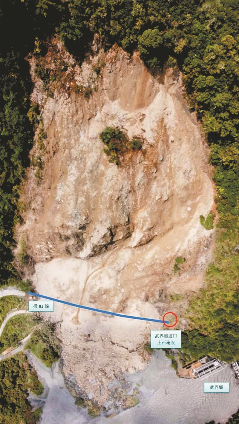 南投縣仁愛鄉武界、萬豐兩部落互通仰賴投83線25公里處疑因連日大雨,7日大規模山崩,道路及武界隧道口被大量土石掩埋,兩部落交通中斷,且崩塌量體太大,恐影響鄰近武界壩體,縣長林明溱昨會勘,預估搶通時間約要1個月。
