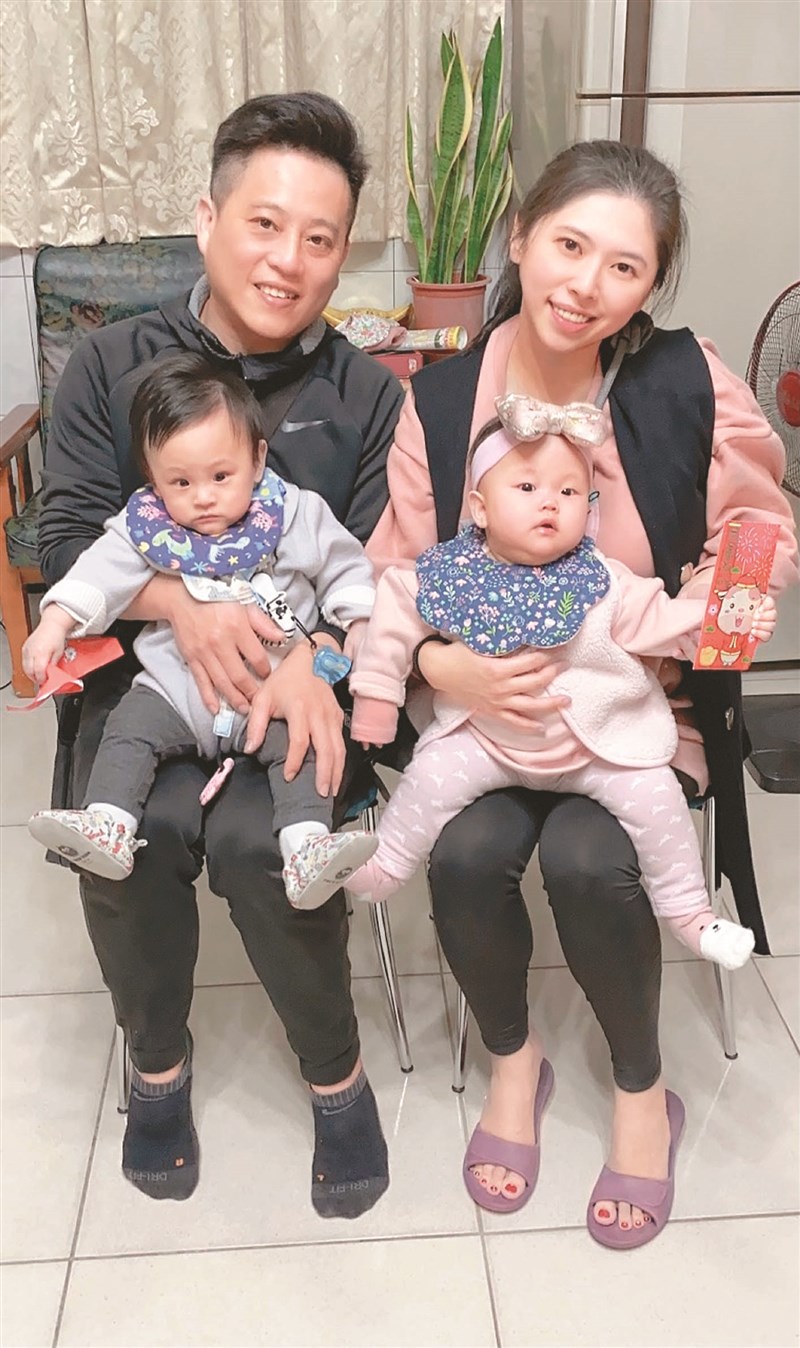 相隔八十八天出生的龍鳳胎兄妹(前)與爸媽合影。圖/中央社