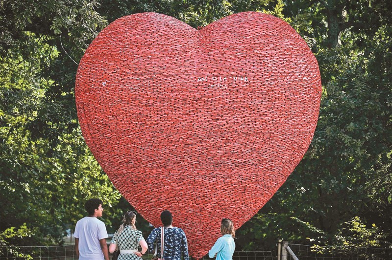 10日在法國西南部波爾多一座公園裡,人們佇足觀賞由義大利裔比利時藝術家朗戈(Alfredo Longo)以回收鋁罐製作的紅心藝術品。朗戈花了3年多的時間,在法國及其他歐洲國家收集了3萬5000個鋁罐完成巨作,目的是提高人們對氣候變化的警覺。圖/法新社