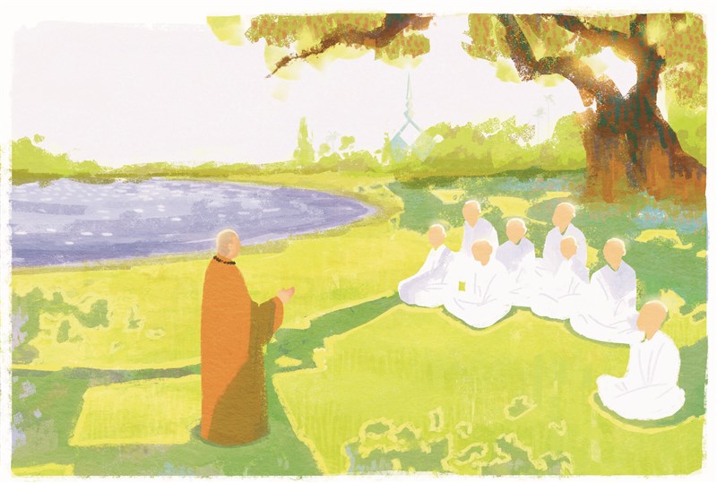 4.與大德師長同行,應行左後方約半步,距離一個肩膀的寬度,不可離太遠。大德若與我們談話時,要靠近,但不可平行。若有事須先離去,或上前開燈、關門,應先說明一聲,才可離去,不可奔跑。